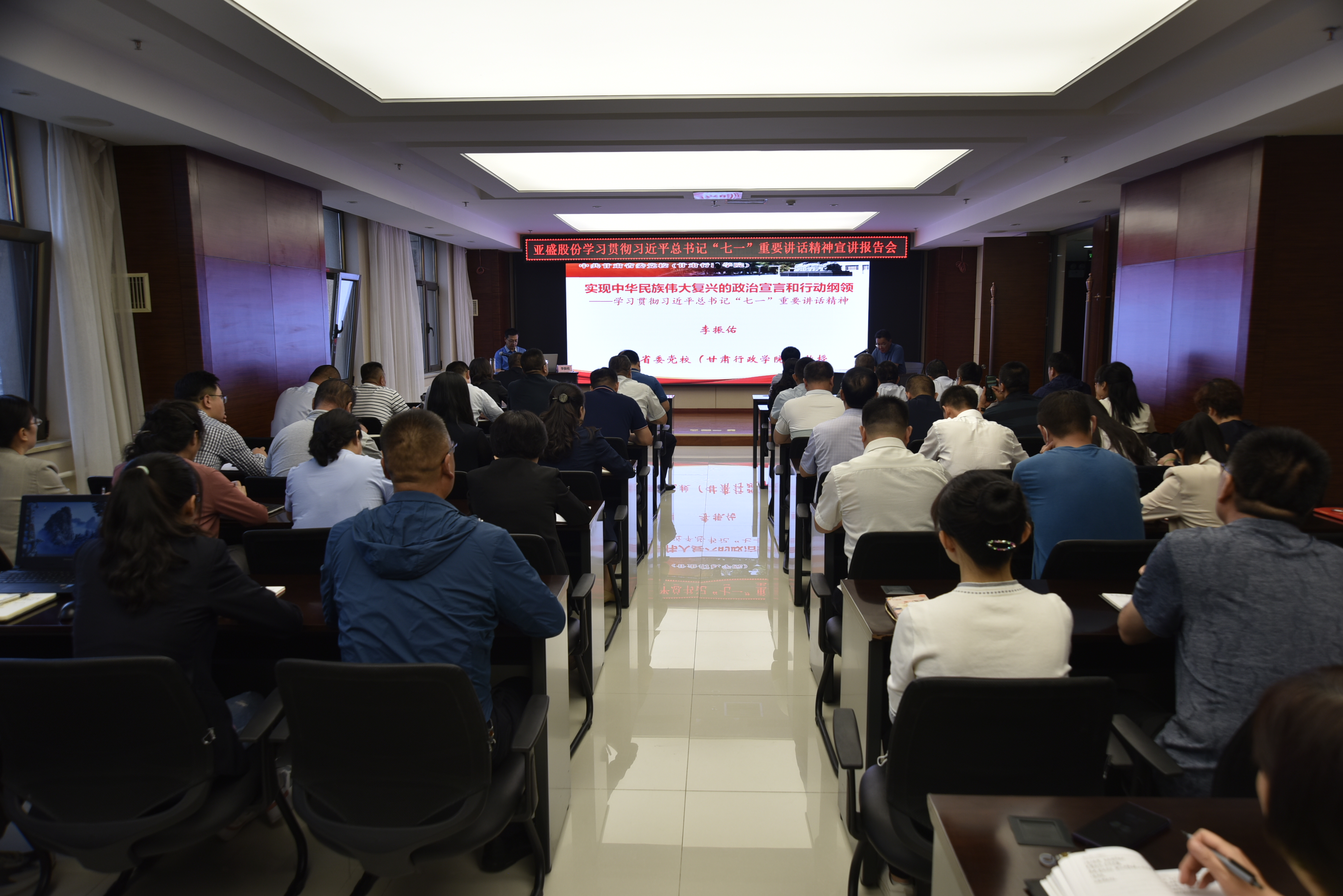 8月30日上午,亚盛集团党委举办学习贯彻习近平总书记“七一”重要讲话精神宣讲报告会。甘肃省委党校(甘肃行政学院)马克思主义学院院长、省委讲师团成员李振佑教授应邀作专题宣讲报告。公司本部全体党员、中层及以上管理人员、部分在兰企业班子成员参加会议。