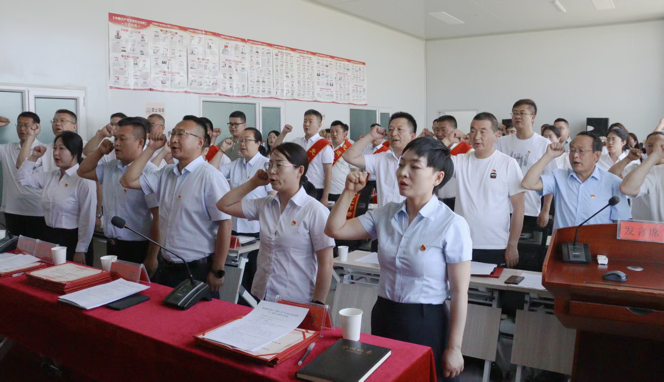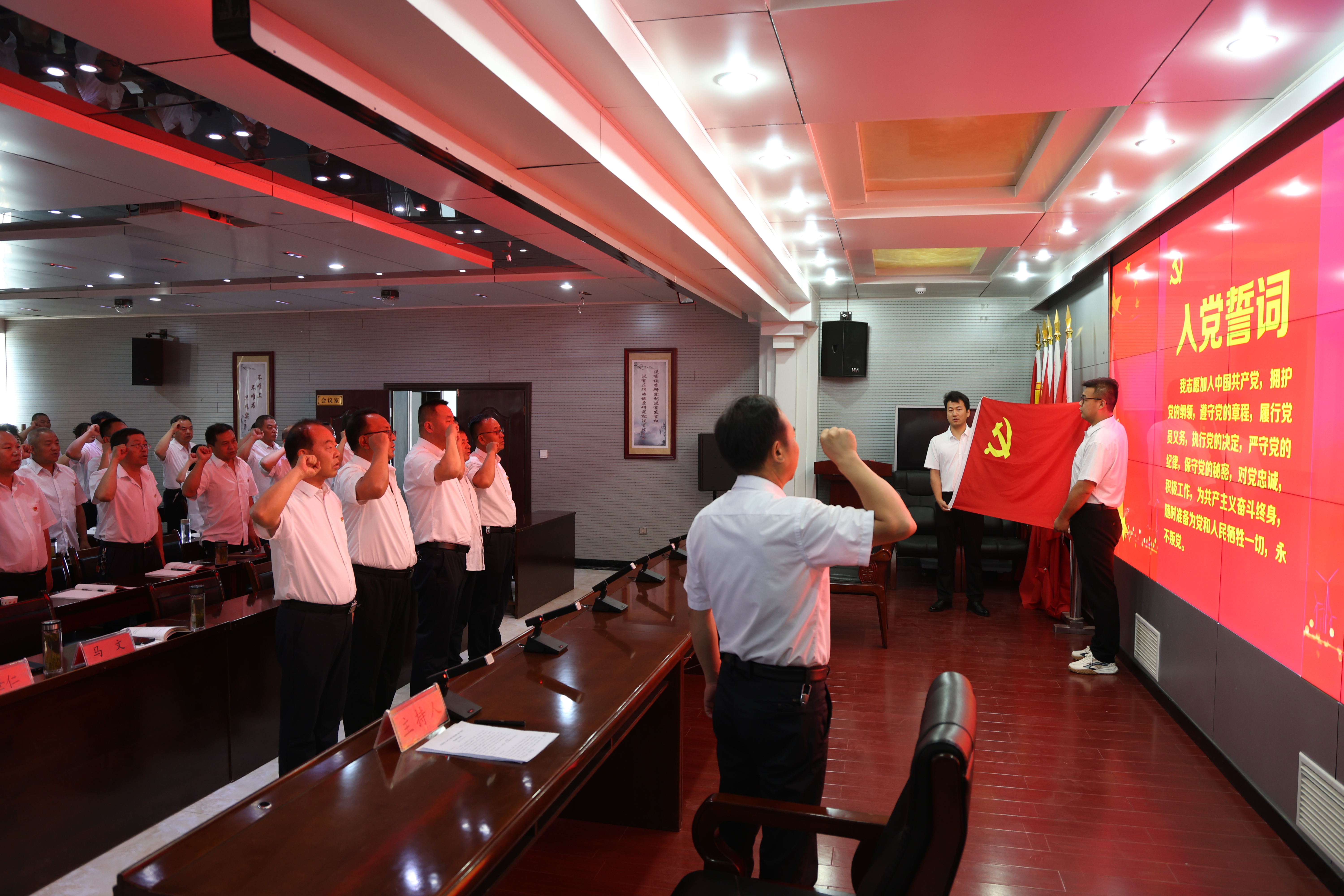 重温誓词,铭记初心使命。活动在庄严的宣誓中开始。全体党员面向党旗,高举右拳,重温入党誓词。新老党员和入党积极分子代表结合自身经历发言,分享入党初心,激励大家立足岗位、担当作为。