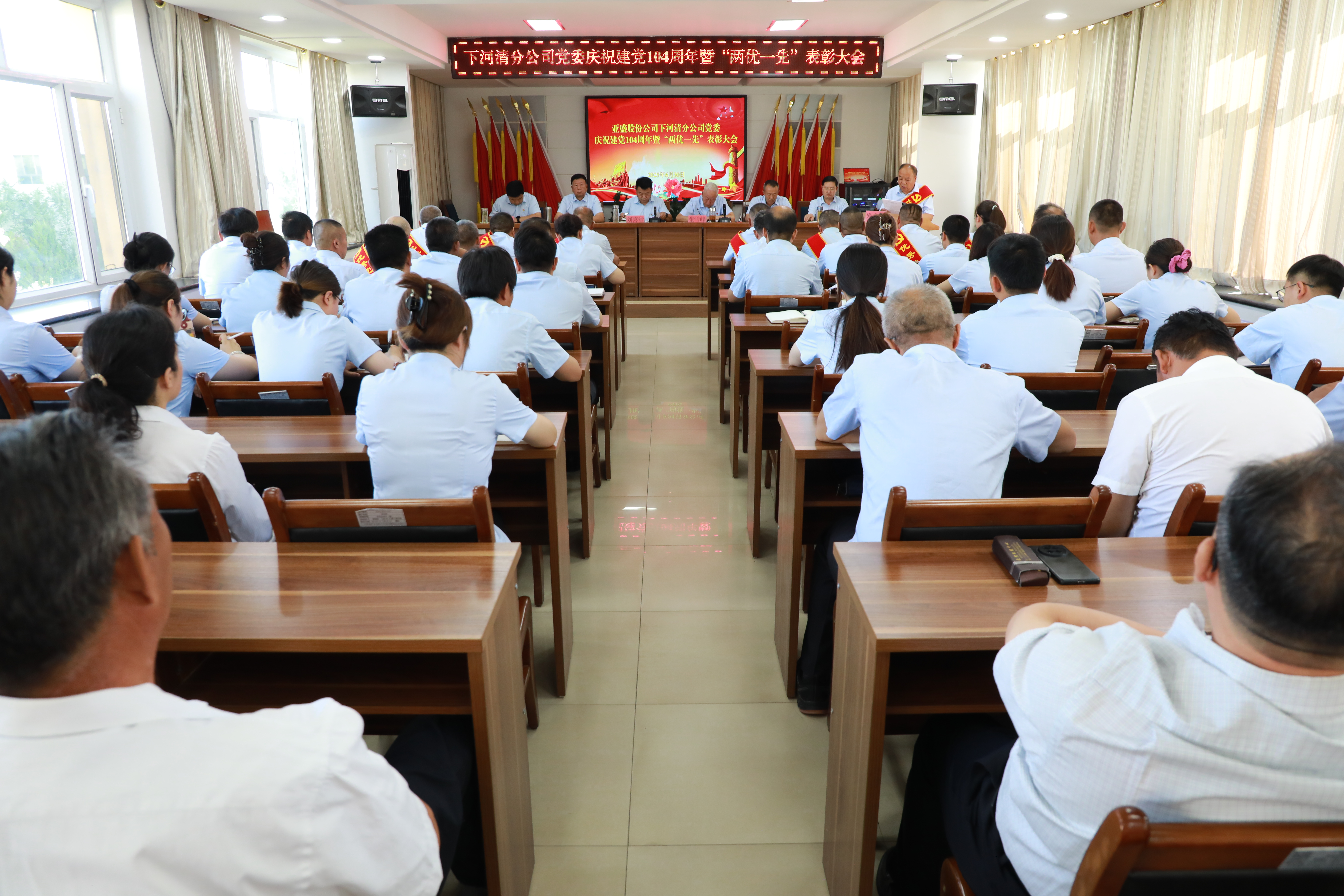 亚盛下河清分公司党委组织召开庆祝建党104周年大会暨“两优一先”表彰大会。公司全体党员、管理人员共59人齐聚一堂,以庄重仪式向党的生日献礼。