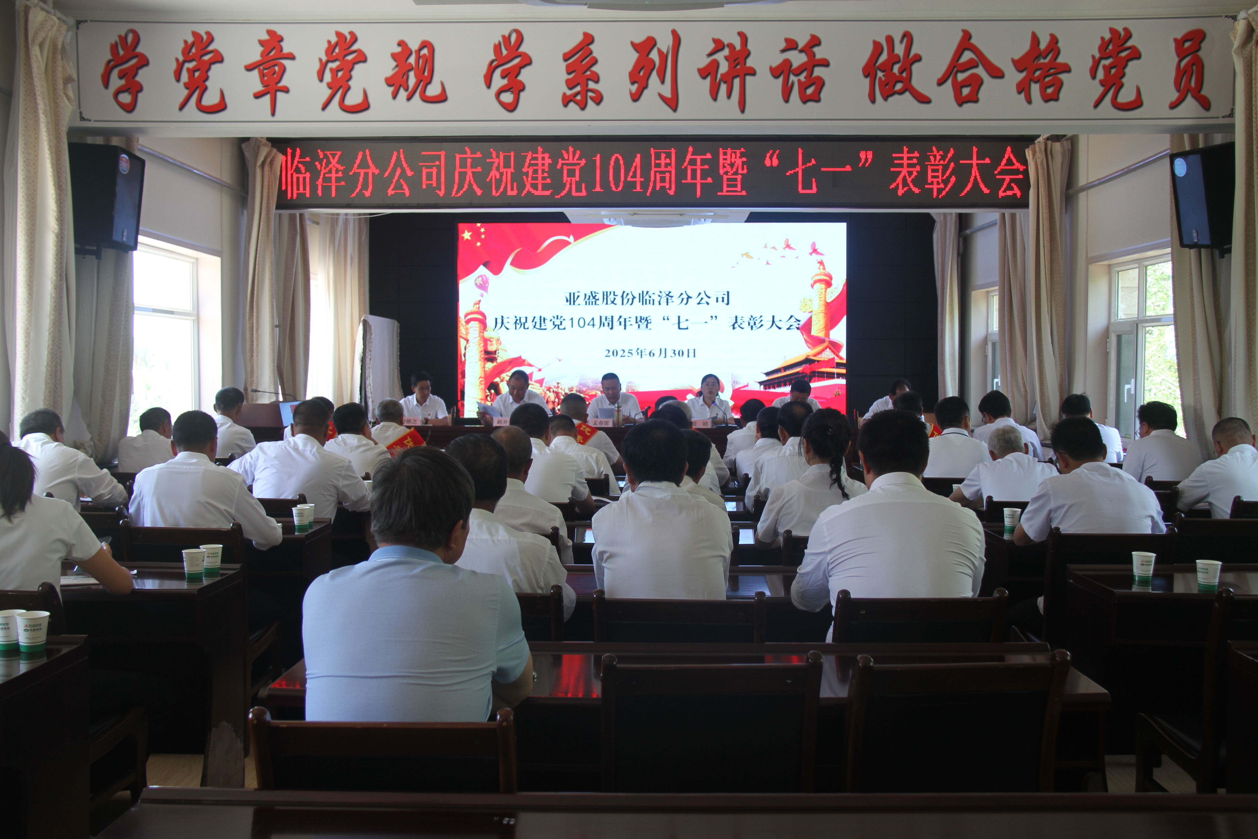 7月1日,亚盛金塔分公司组织召开庆祝建党104周年暨深入贯彻中央八项规定精神警示教育大会。公司领导班子成员、全体经营管理人员、党员代表等50余人参加会议。